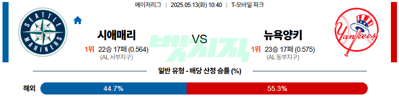 5월 13일 야구중계 시애틀 뉴욕양키스 MLB 무료중계 스포츠분석