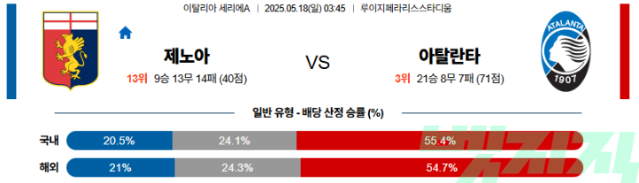 5월 18일 축구중계 제노아 아탈란타 이탈리아 세리예A 스포츠분석