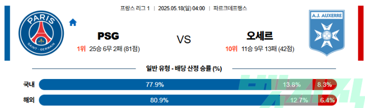 5월 18일 축구중계 PSG 오세르 프랑스 리그앙 스포츠분석