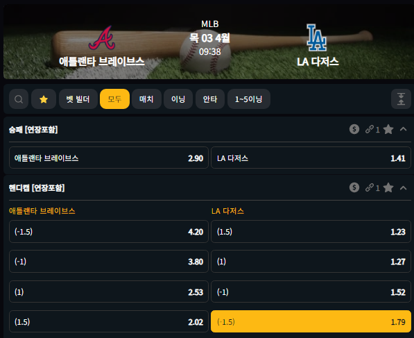 LA 다저스 -1.5 마핸승 1.79배당 (벳80기준)