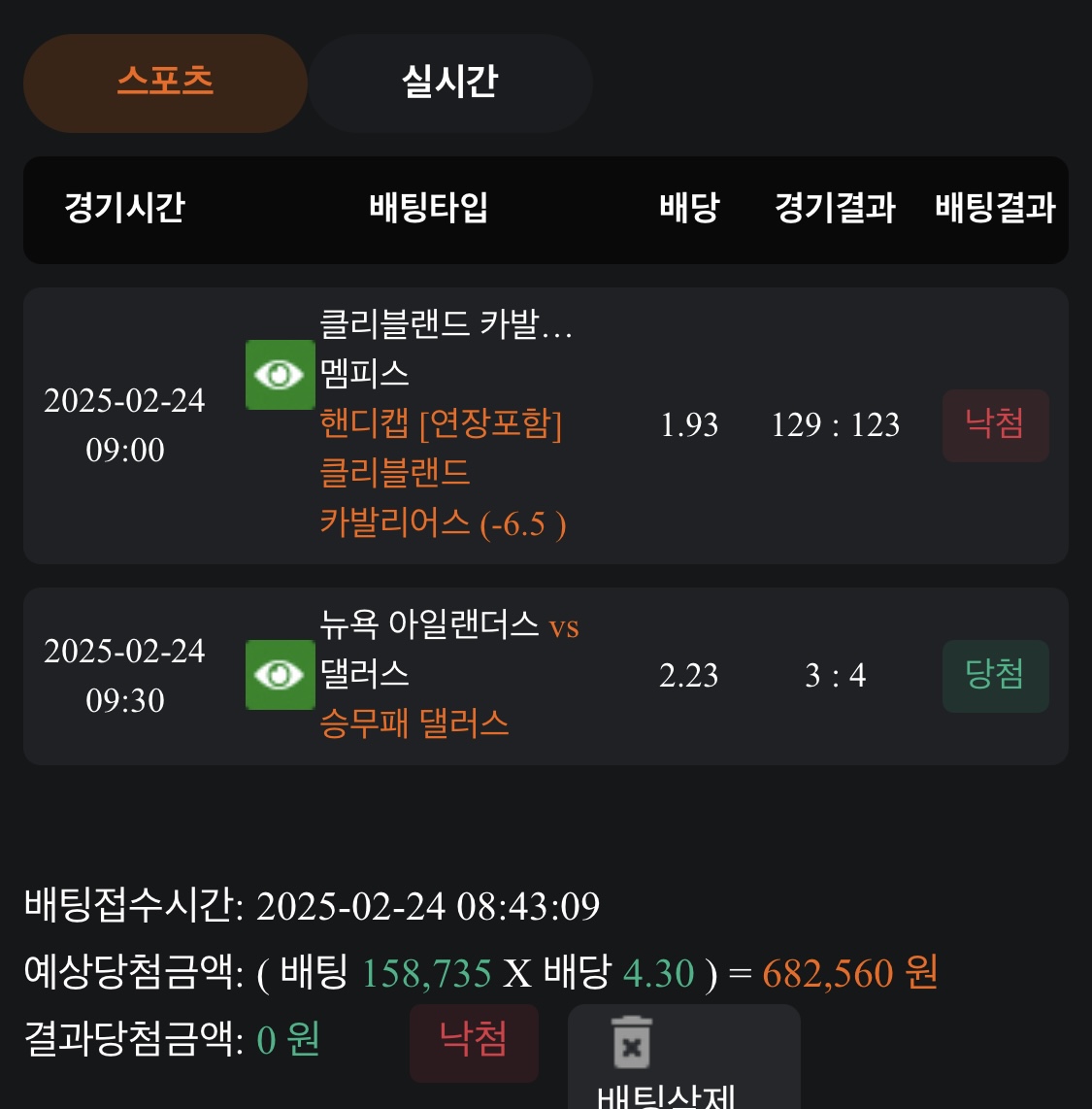 실시간 적중과 미적중