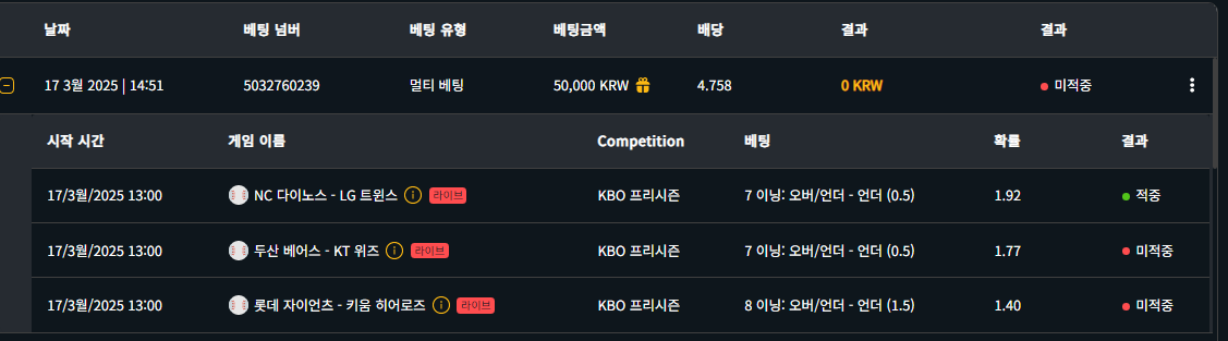 실시간 적중과 미적중